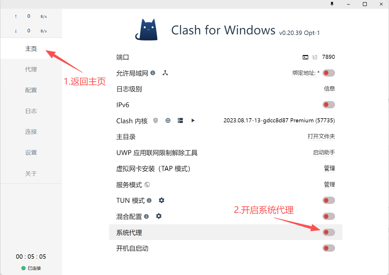 为了让浏览器等系统应用程序自动使用 Clash 代理,需要启用系统代理设置。